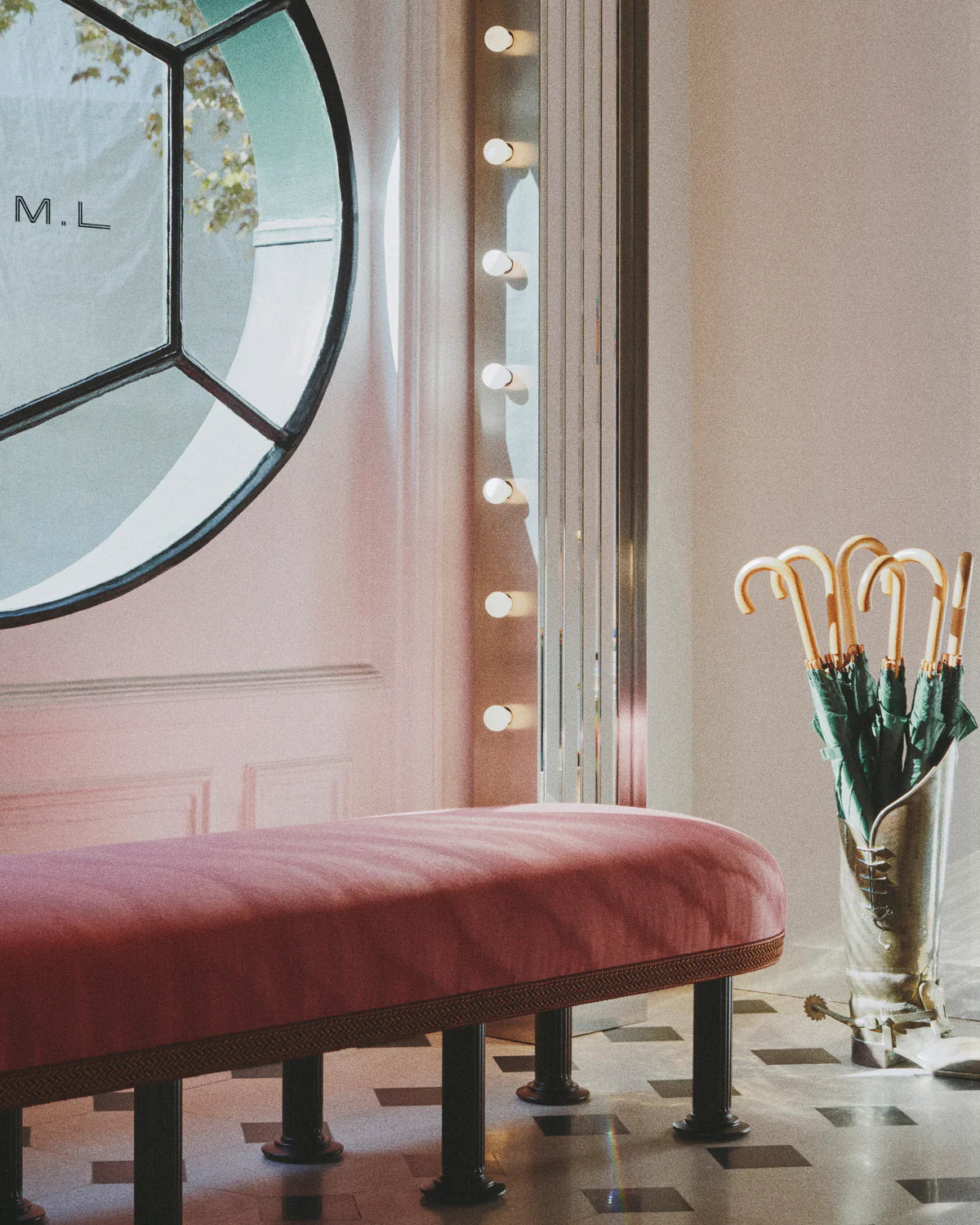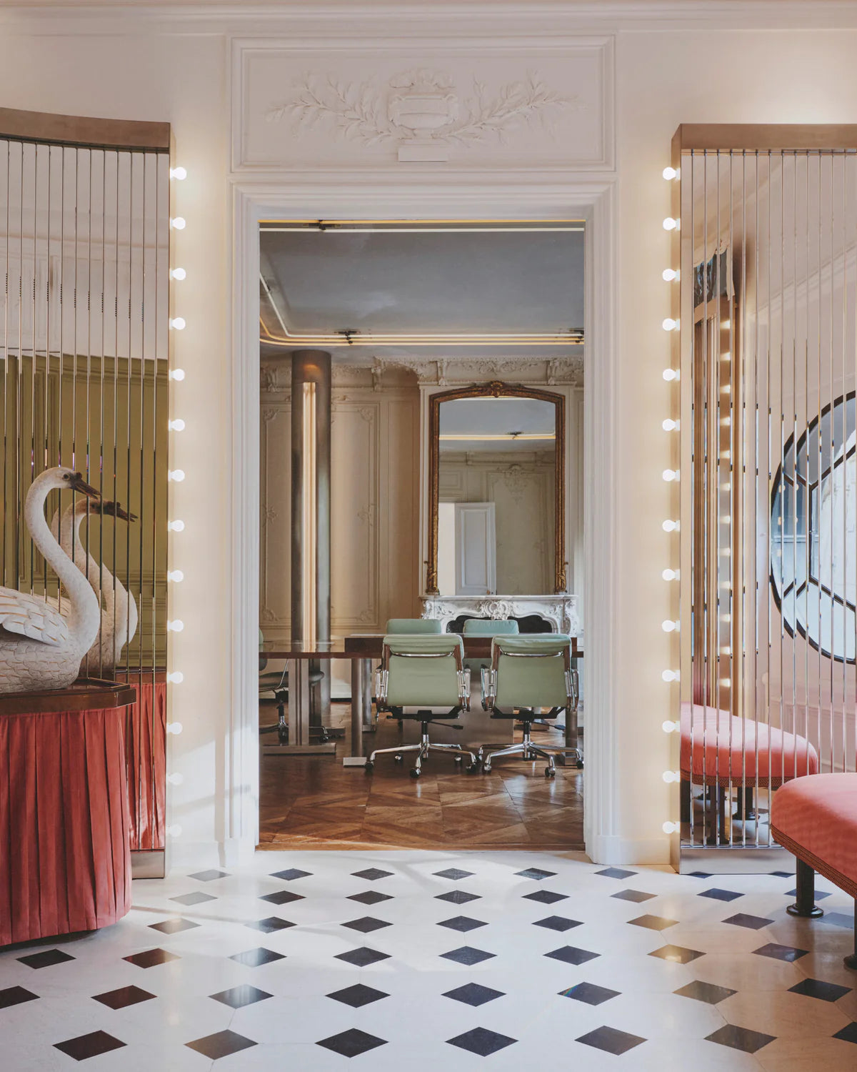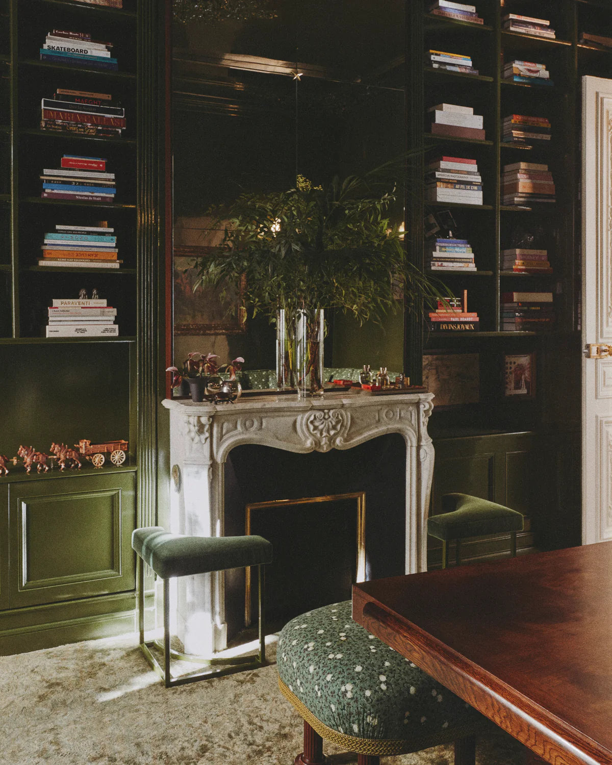 Energized by neon pink in the hallway, the Maison’s signature green features throughout the showroom and through into Marie’s personal office, where mirrors bring the verdant outside courtyard, right into the space. Far from the salons of Place Vendôme, here visitors linger over refreshments on plush couches amongst books, vintage Americana and objects from Marie’s travels around the world.