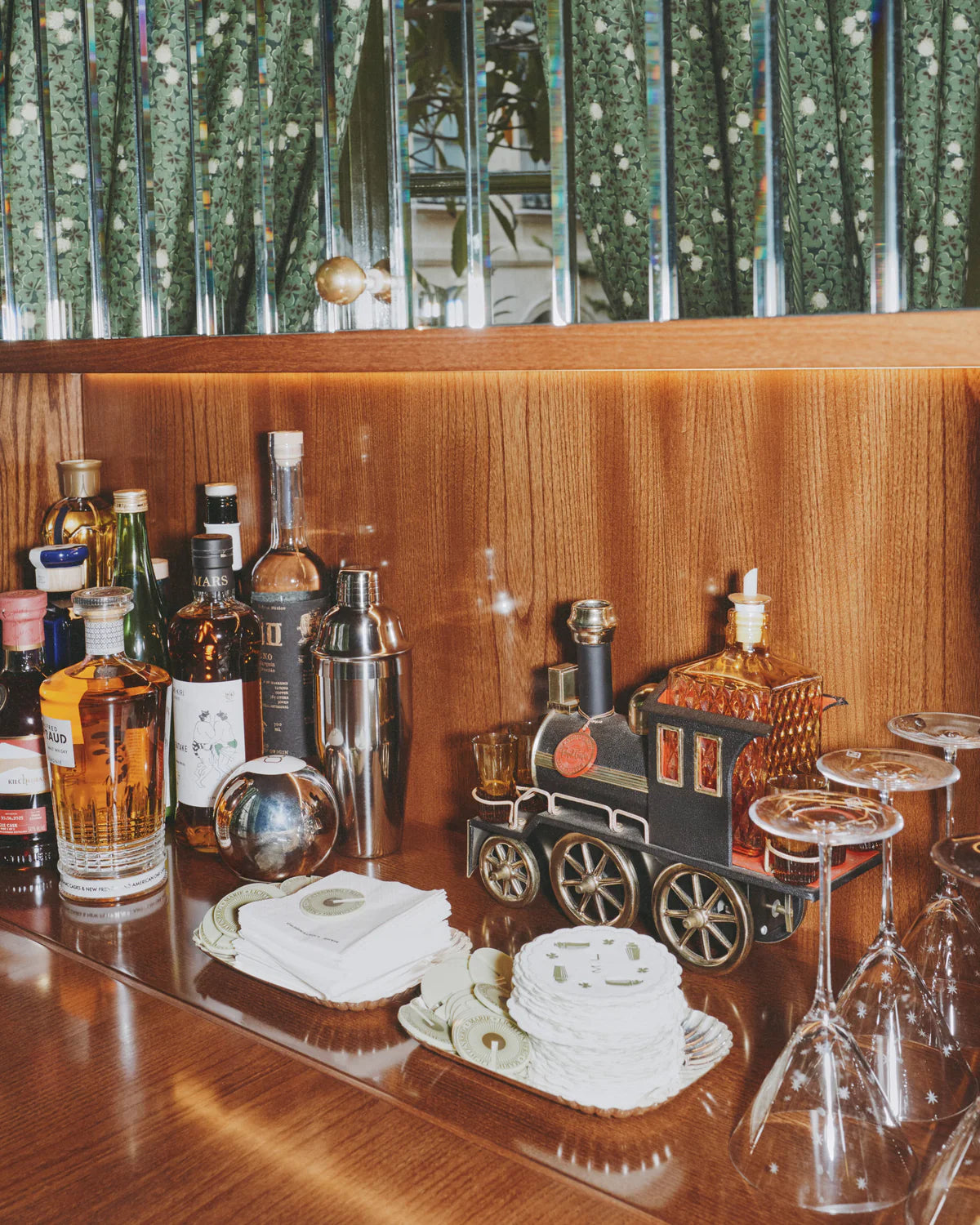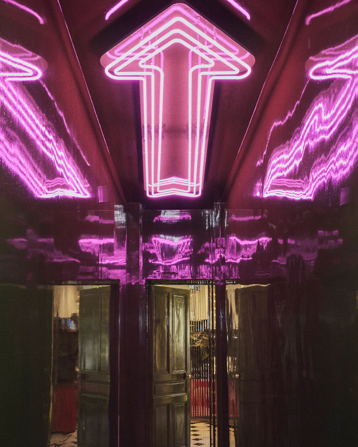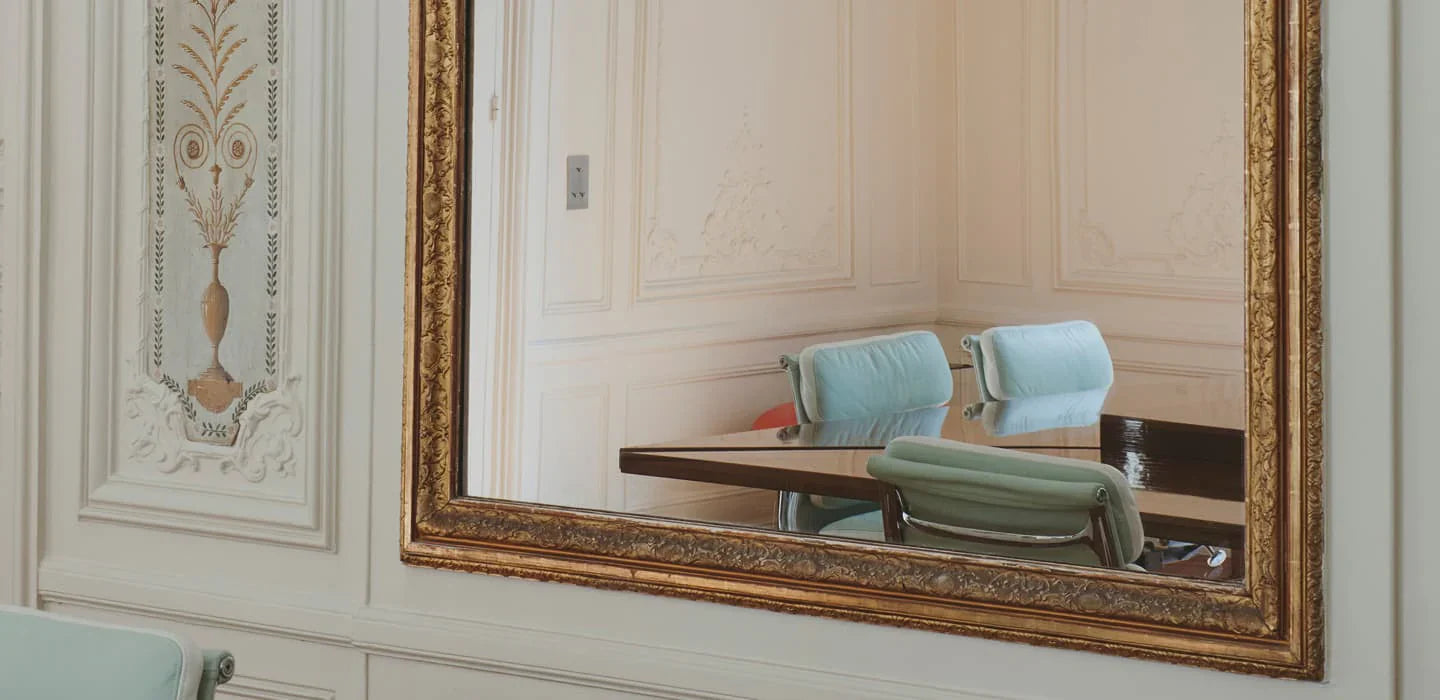 Energized by neon pink in the hallway, the Maison’s signature green features throughout the showroom and through into Marie’s personal office, where mirrors bring the verdant outside courtyard, right into the space. Far from the salons of Place Vendôme, here visitors linger over refreshments on plush couches amongst books, vintage Americana and objects from Marie’s travels around the world.