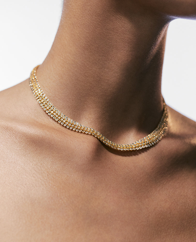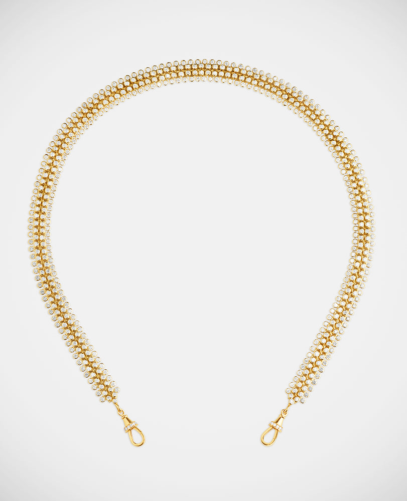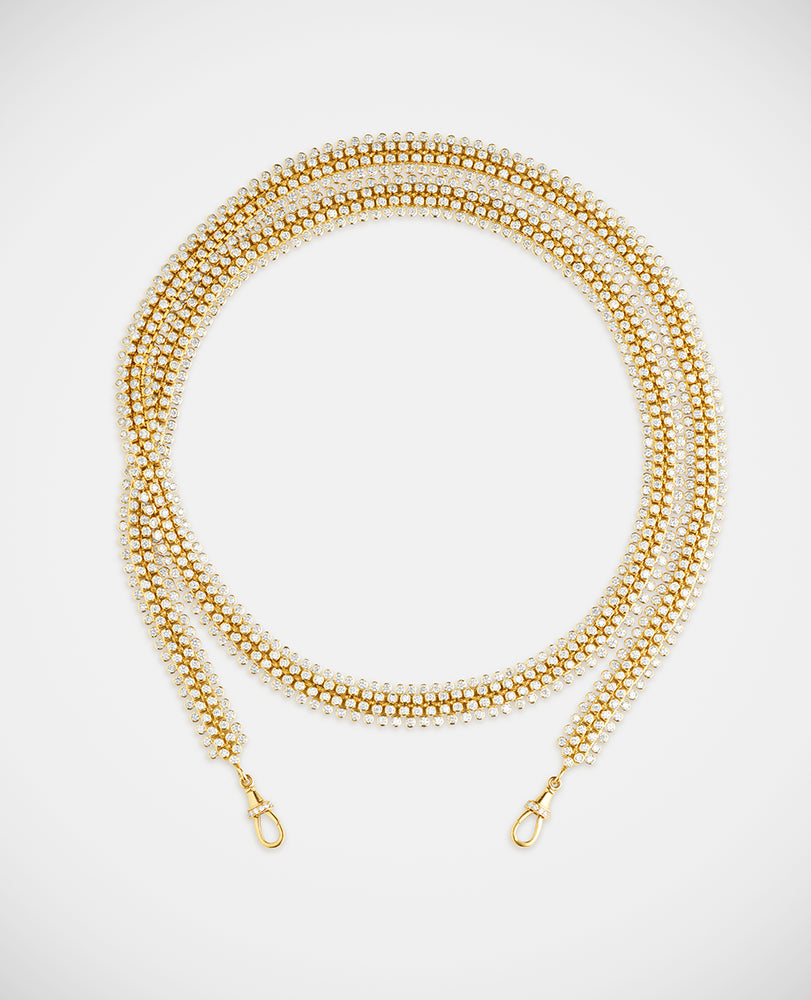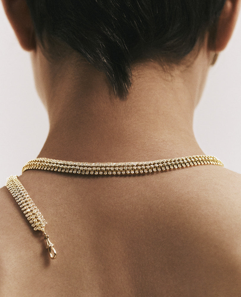 Inspired by the forçat chain of her mother’s Martiniquan roots, Marie Lichtenberg sought out some of the world’s best craftspeople to create her gold chains. Choose from 18kt gold stick chain, elongated gourmette links, twisted Indian rope chain and the classic Rosa open links, or go for one of her exquisite custom link variations; like the mesh diamond rivière, the gold and enamel mushroom chain, or the Evil Eye necklace. All our chains are designed to fit Marie Lichtenberg locket and scapulars.